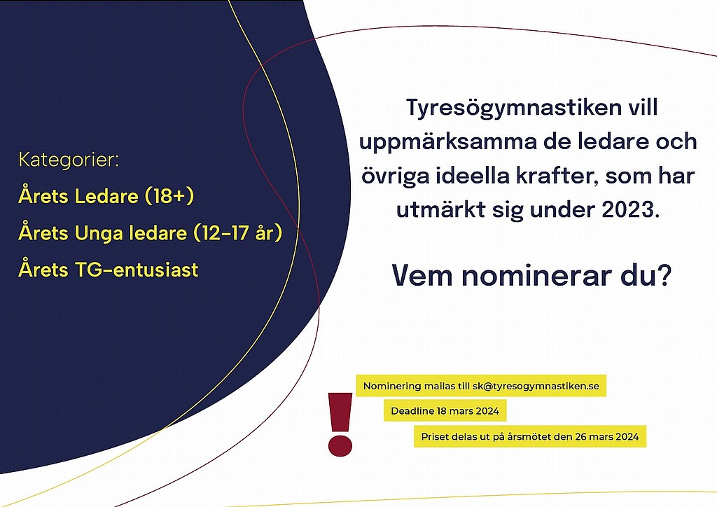 Nomineringarna skickas till sk@tyresogymnastiken.se senast den 18 mars och priserna delas ut på årsmötet den 26 mars.